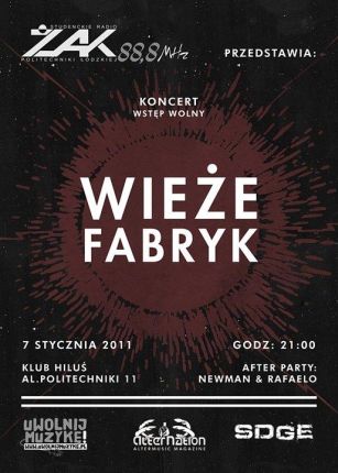 Wieże Fabryk powracają do Łodzi! Z okazji premiery płyty, a także tego, że zespół od 2 lat nie koncertował w rodzinnym mieście, Studenckie Radio Żak Politechniki Łódzkiej, wraz z portalem uwolnijmuzyke.pl oraz alternation.pl zapraszają na koncert. Czy można sobie wyobrazić lepszy początek roku?