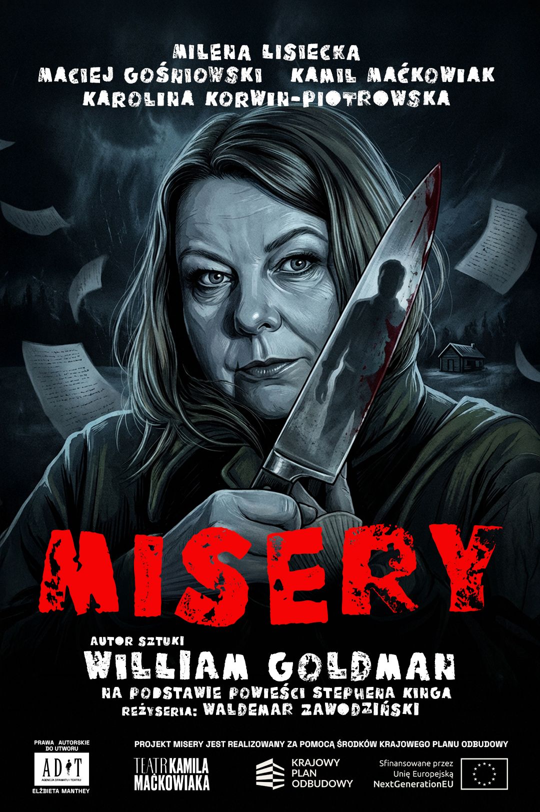Spektakl „Misery” to thriller psychologiczny, ukazujący mechanizmy obsesji, samotności i potrzeby kontroli. Wciąga widza w mroczny, skomplikowany świat, gdzie każdy gest i słowo mogą zmienić los bohaterów.